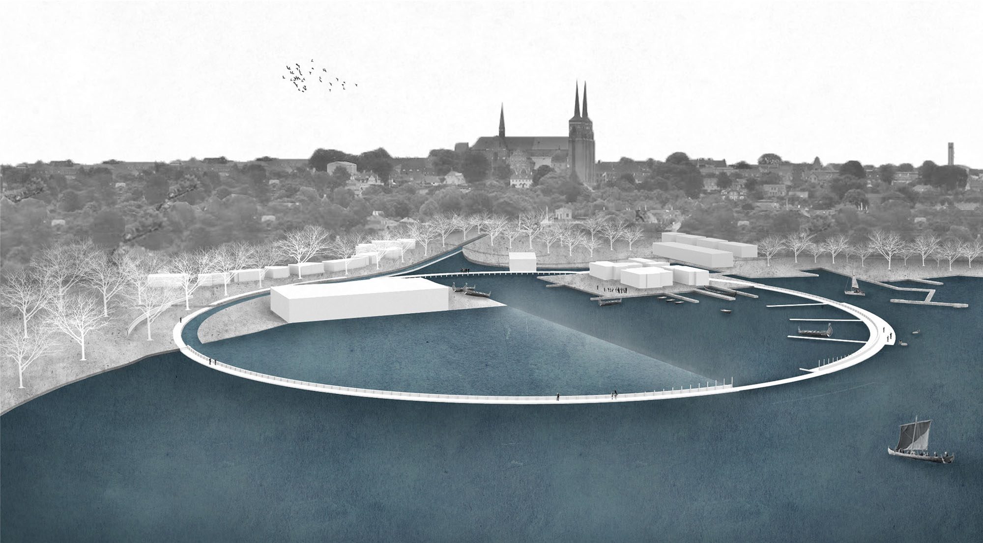 I idéen snor en cirkulær kystsikring sig om Vikingeskibsmuseet, bevarer udsigten over fjorden ved at hæve vandspejlet foran hallen og giver Roskildes borgere en rekreativ promenade på havnen. Vikingeskibe vil kunne opleves i hallen og på vandet, og den udvidede havn styrker båndet til byen og domkirken.